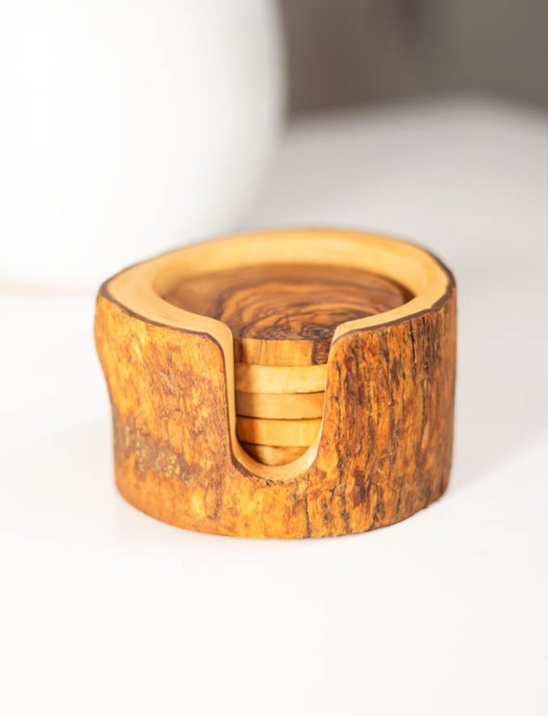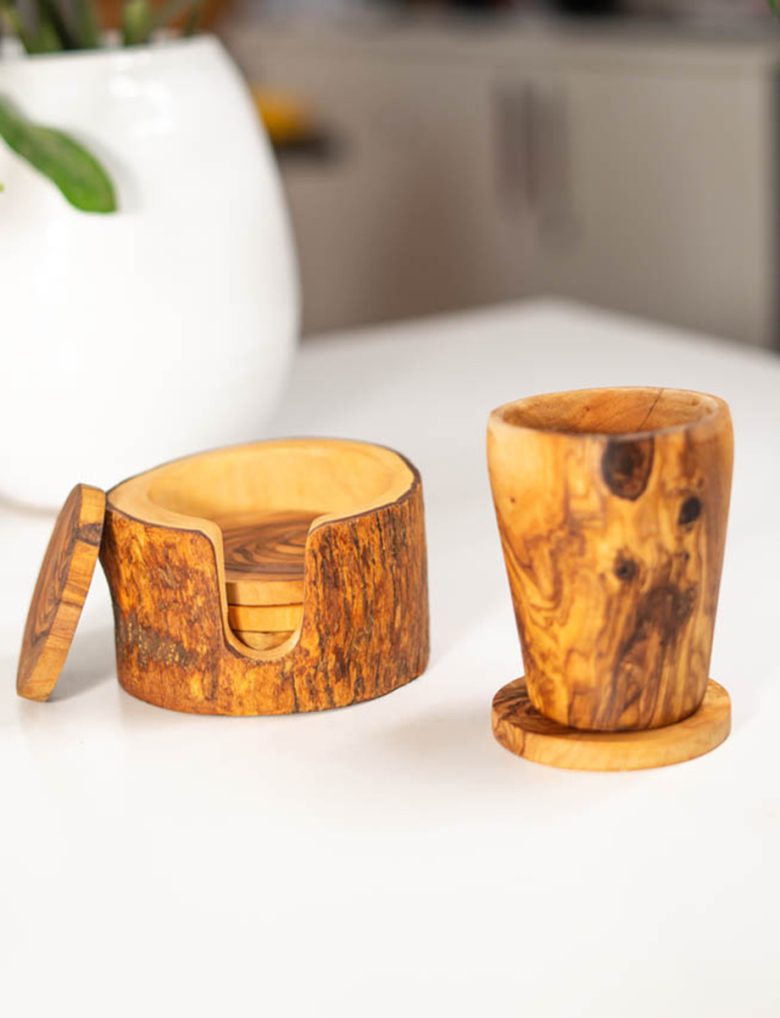 This handcrafted set of six coasters, made from durable Tunisian wood, comes in a rustic storage box for easy organization. Each coaster features unique grain patterns, adding a touch of natural elegance while protecting your surfaces from moisture and scratches.