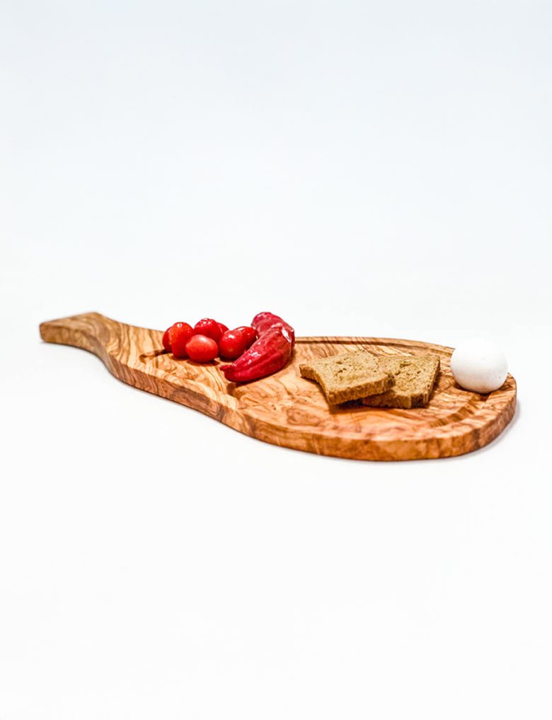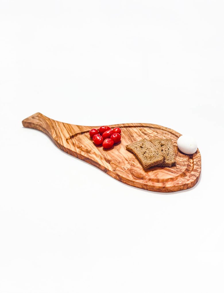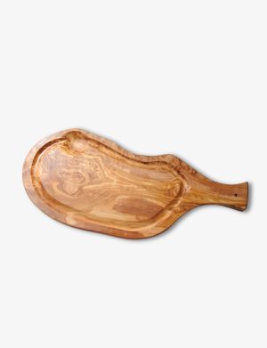 This handcrafted carving board features a sturdy handle for easy grip and maneuvering, made from durable Tunisian wood. Its smooth surface is perfect for slicing and serving meats or vegetables.