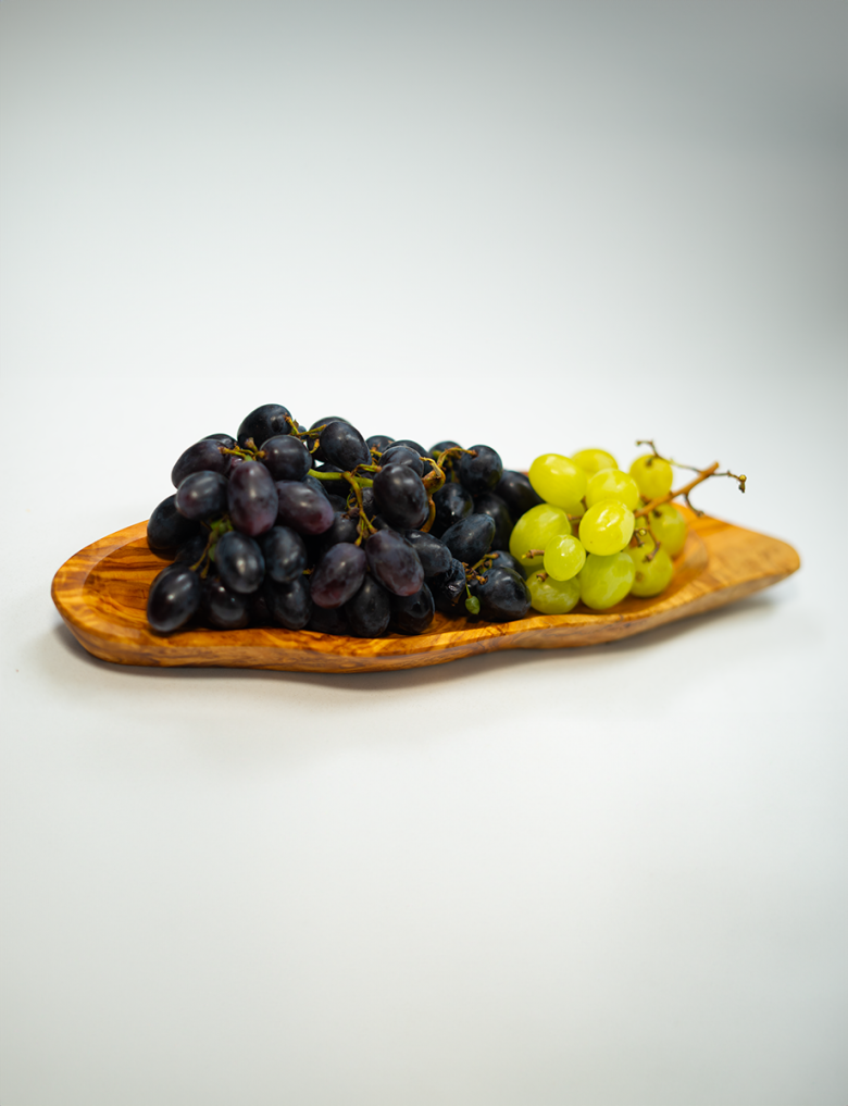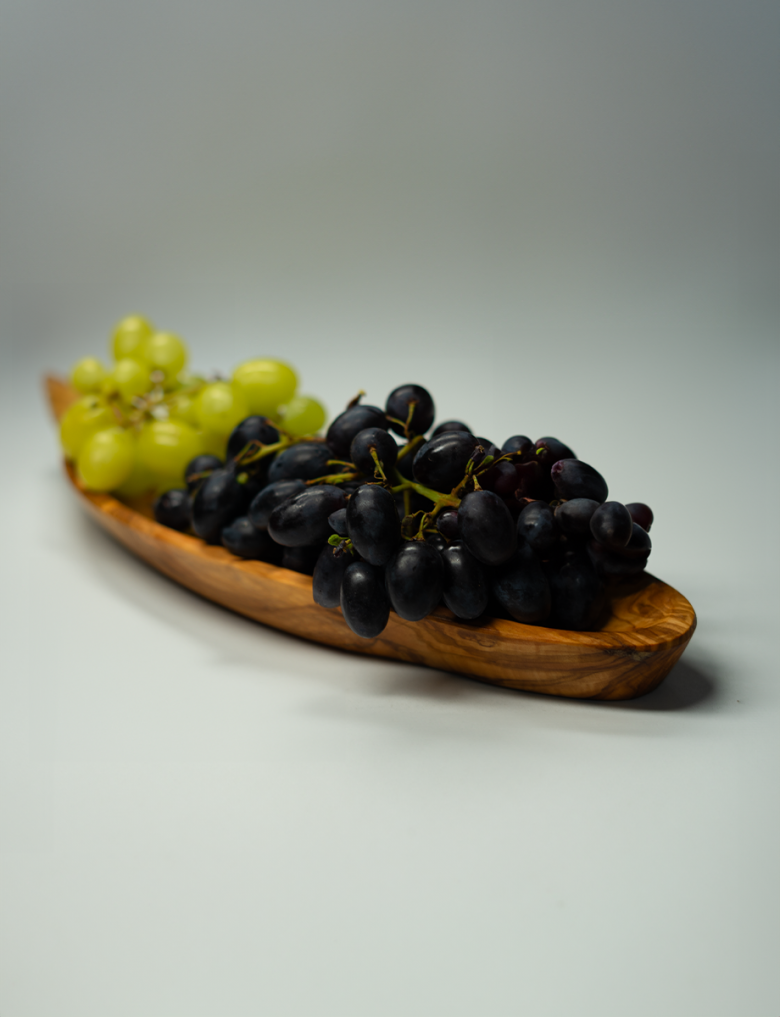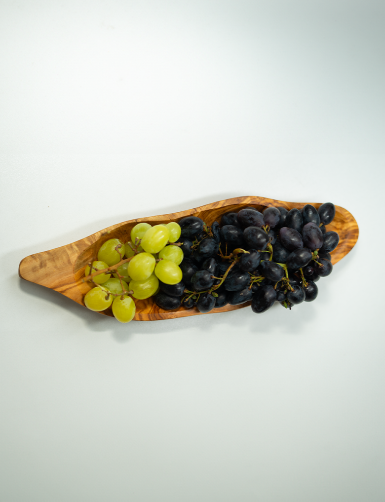 This handcrafted grape dish, made from high-quality Tunisian wood, is designed with a sleek and shallow surface, ideal for elegantly displaying and serving grapes or other small fruits. Its natural wood grain adds a rustic, sophisticated charm.