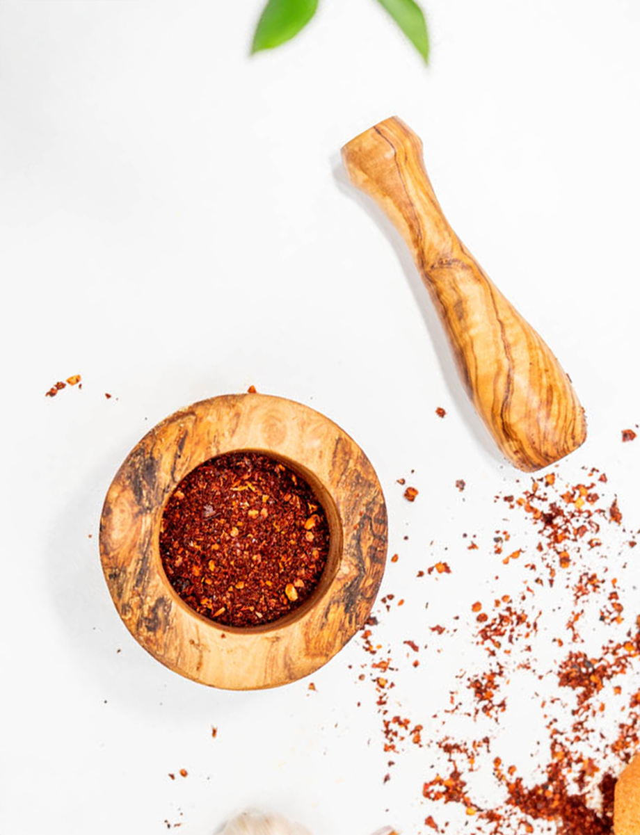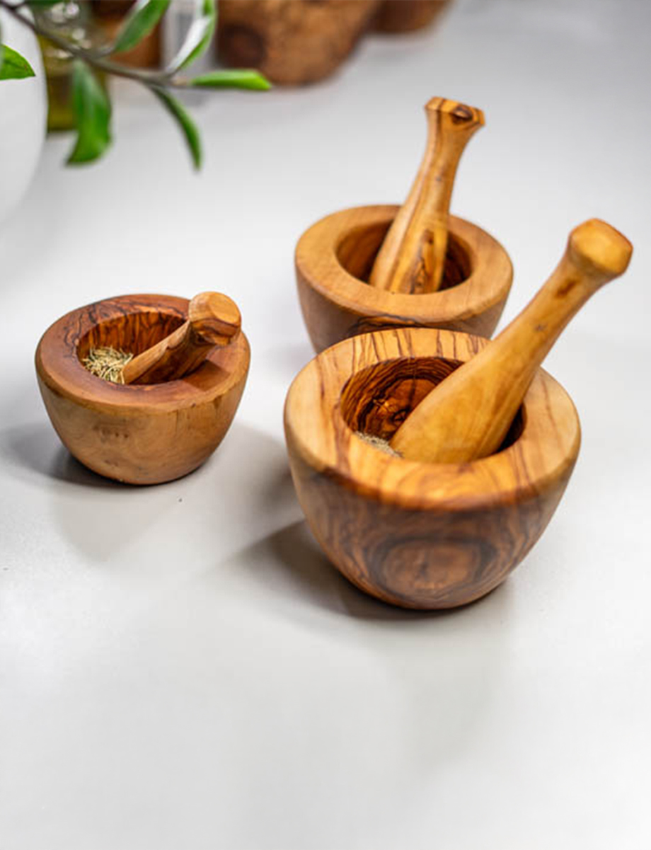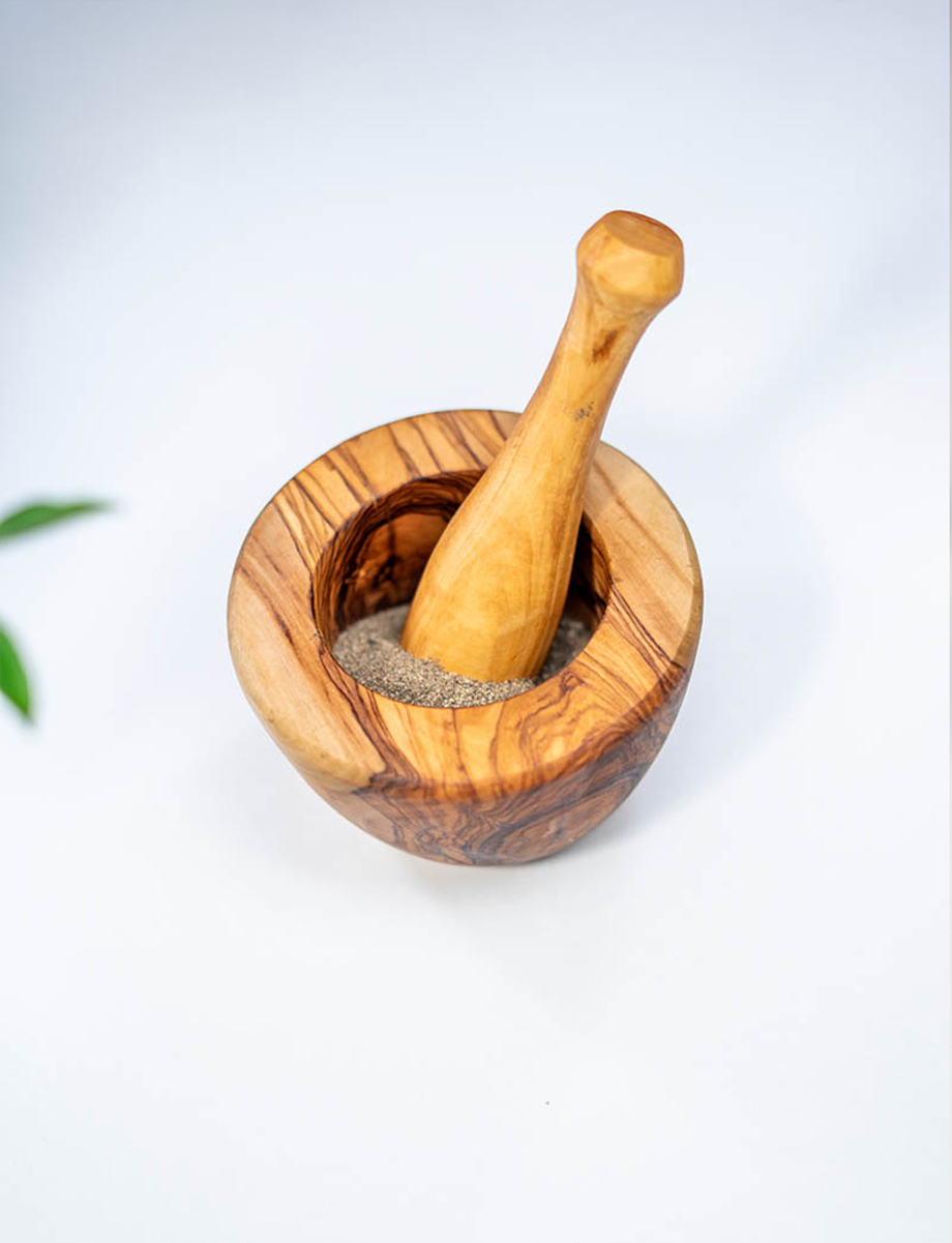 This handcrafted flat-style mortar and pestle, made from durable Tunisian wood, is designed for efficiently grinding herbs and spices. Its sleek, minimalist design and natural wood grain add a rustic elegance to your kitchen essentials.