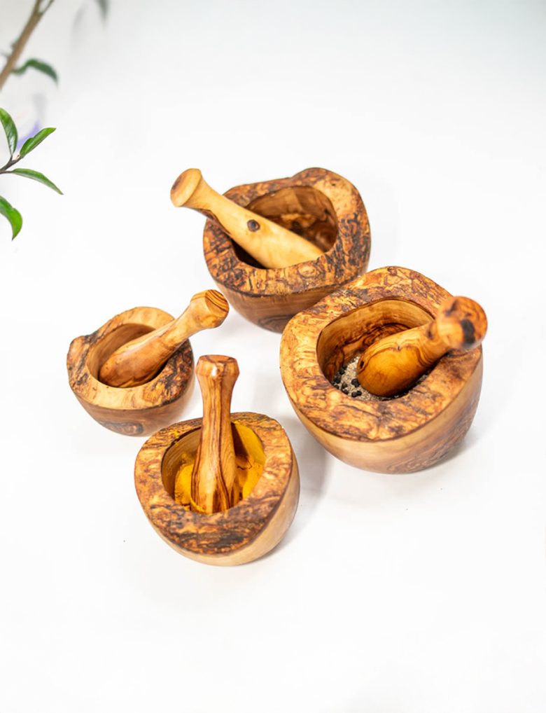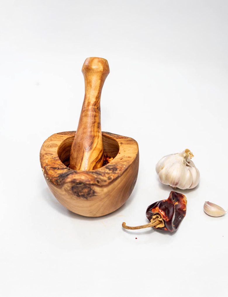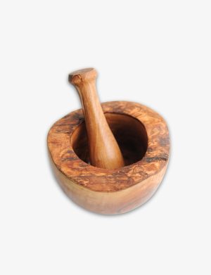 This rustic mortar and pestle, handcrafted from durable Tunisian wood, features a natural finish that highlights its unique grain and texture. Perfect for grinding herbs and spices, it adds a charming, earthy touch to your kitchen essentials.